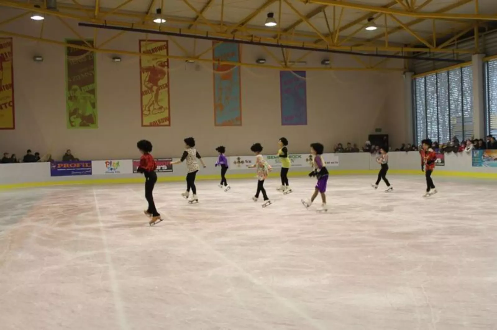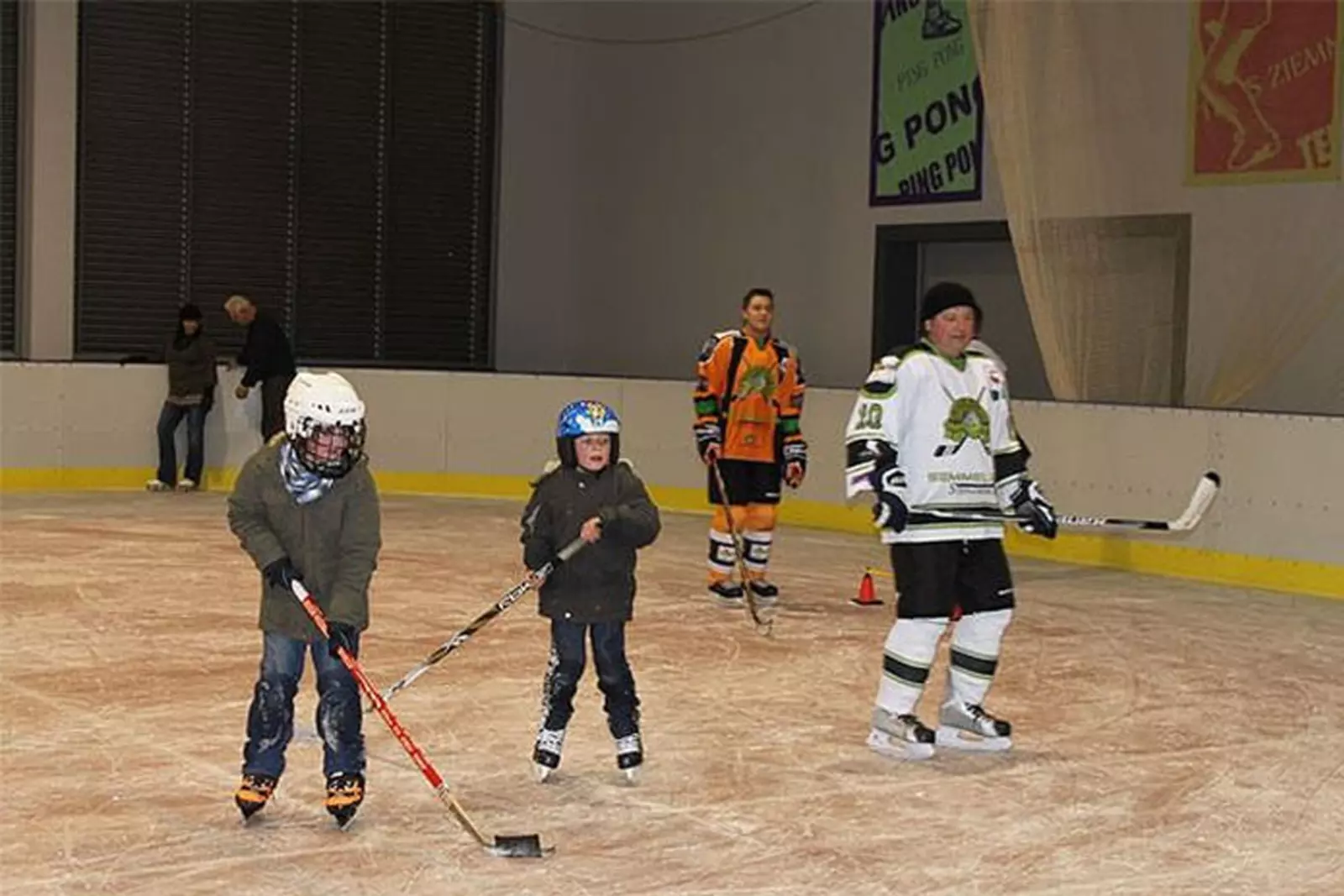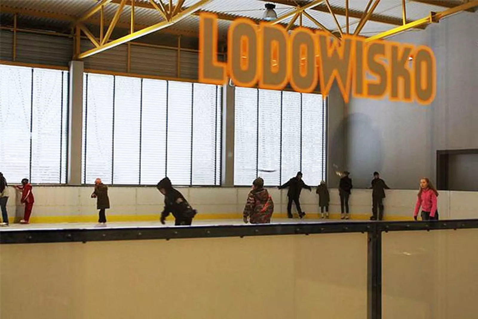 – wymiary: 20×30 m (600 m²) lodowisko kryte, okolone bandami;