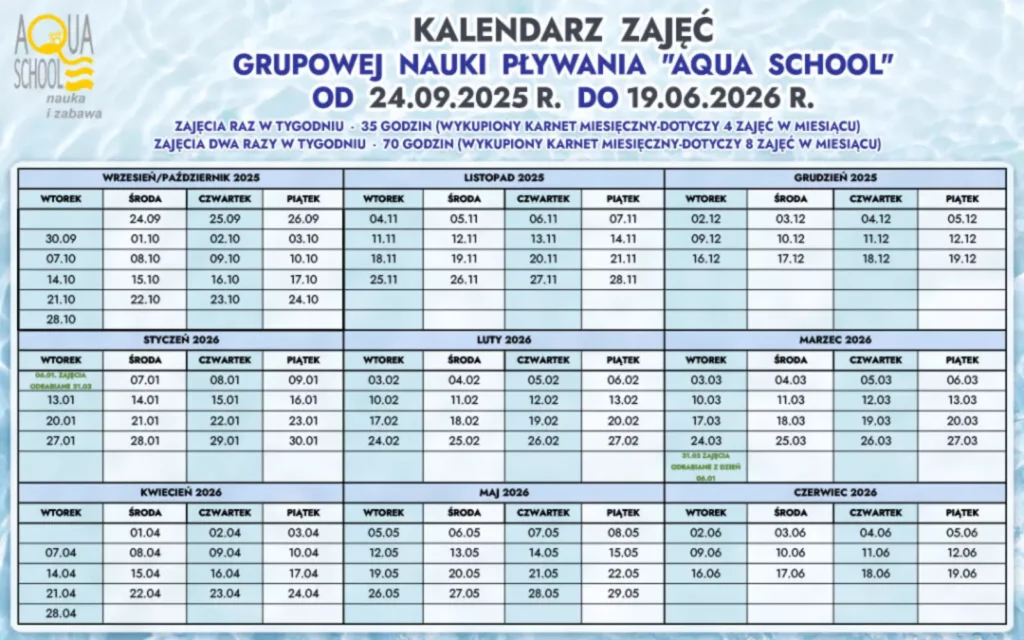 – sezonowa nauka pływania trwa od września do czerwca (jeden raz lub dwa razy w tygodniu)